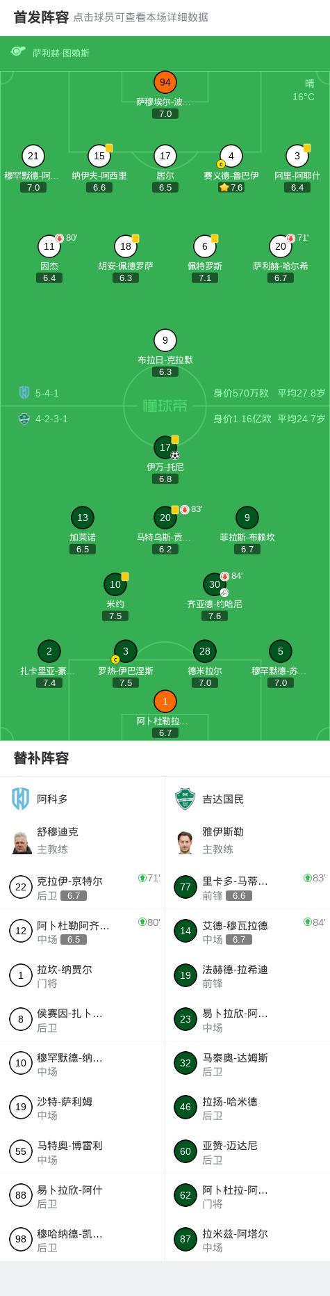 吉达国民1-0阿科多,伊万-托尼打进全场唯一进球