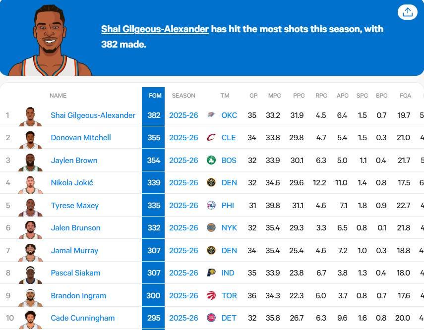 在今日比赛过后数据进行了更新,亚历山大以382次运动战投篮命中数位居全联盟第一,领先第二名米切尔27次;此外他本赛季共获得314次罚篮,排在阿夫迪亚之后位居第二。
