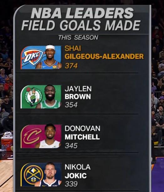 比赛期间,转播方晒出了一组数据,在本赛季的运动战投篮命中数方面,雷霆队当家球星亚历山大高居榜首。